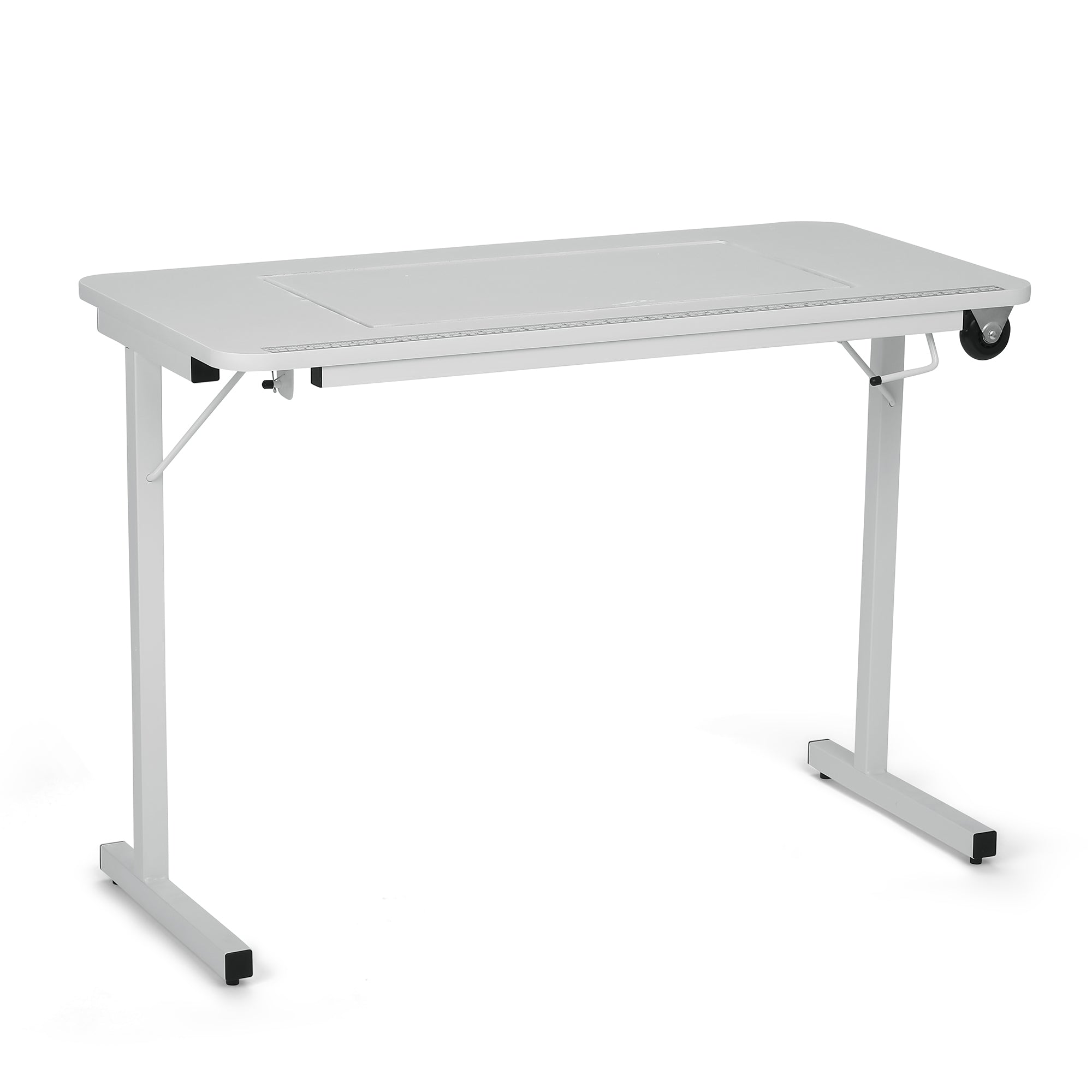 Gidget II features a 2-position manual sewing lift, steel locking legs, a built-in measuring decal and 2 durable wheels for easy transportation! Perfect for community sewing guilds, RVs or a 2nd sewing station!