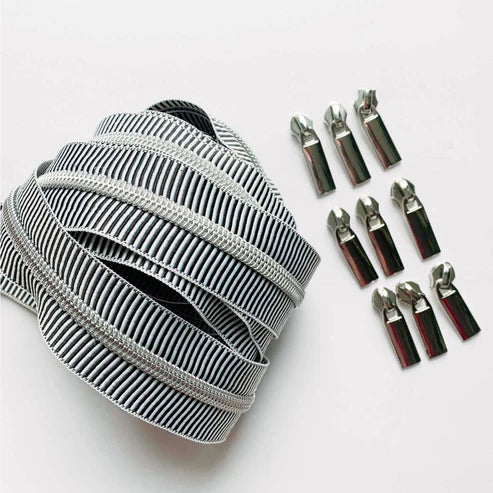 This pack includes black and white big stripes- they are wider than our other striped zippers and they are offset, + 9 RAINBOW teeth & pulls.